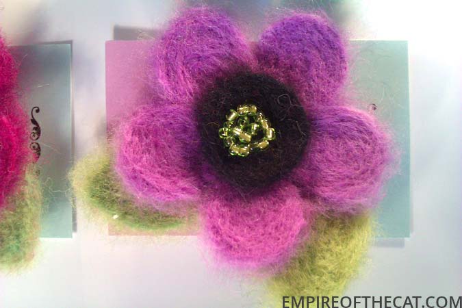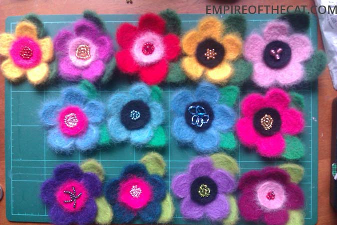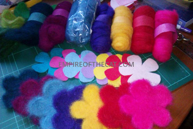 This week (and it has been a week!) I have been making these felted flowers. I used this wool felt as a base to cut out all the flowers and then needle felted them using the merino roving.