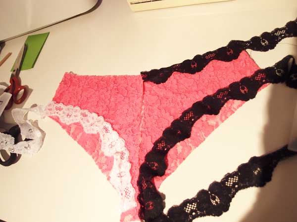 I needed to find some lace to trim the edges and found this one that I had in black and white. The black/pink combination really wasn’t my cup of tea, so I went with the white.
