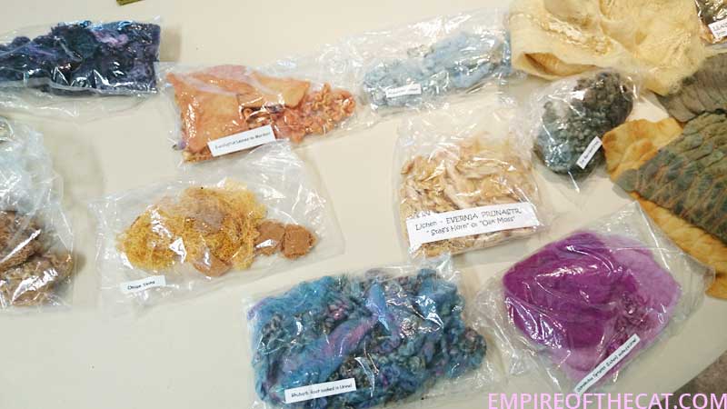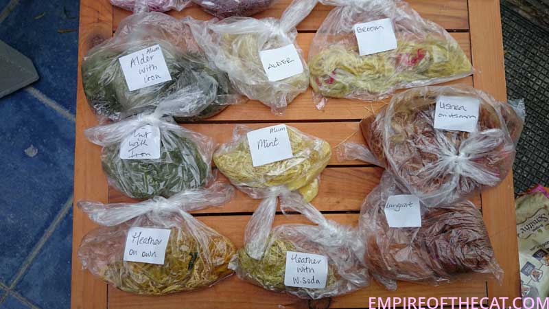 It was very much a hands-on workshop, with seven of us gathered around the cooking pots like the witches from “the Scottish play”, very hubble, bubble, toil and trouble. We started with lichens native to Scotland, and requiring no mordants to fix the dye. Then moved on to other plants like Heather, Alder, Mint, Broom, Rhubarb root and Red Onion, experimenting with various mordants and additives. We dyed mostly wool yarns and fleece, and a bit of silk, but I also brought along some plant fibres (cotton, cheesecloth, linen) and some roving. The animal fibres do take the dye a lot better and much deeper than the plant fibres. We started at 10am and were finished by just after 3pm, after an hour for lunch.
