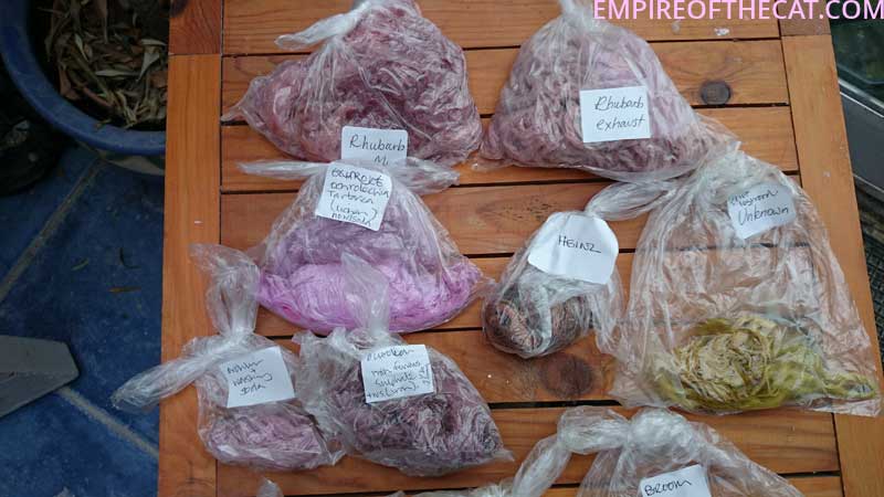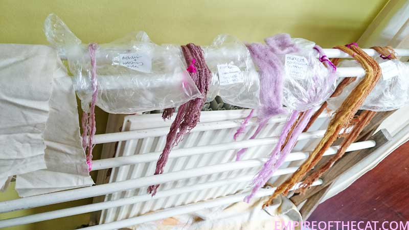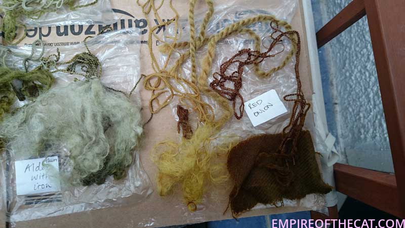 I’m so excited and impressed by some of the amazing colours you can get from these (mostly) very common plants. I can’t wait to see what I can find on my trip next month. Even Wombat was intrigued by the smells or maybe he just wanted some of that yarn! In any case, he’s doing a good job of keeping an eye on it for me LOL
