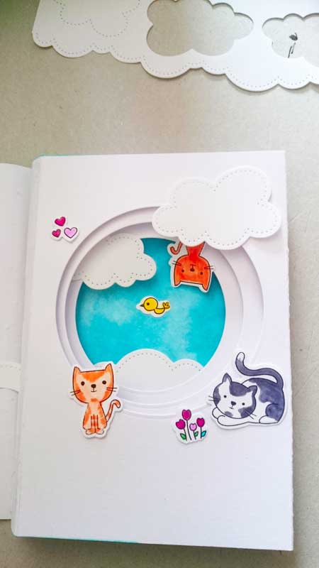 It’s actually half a tree, and they have two of them, so you can have one facing left or right or put them both together to make a whole tree. My idea was to have the cats up in the clouds on the inside (IDK as they are not angels-in-clouds kitties, just very high up kitties who climbed the tree and then higher beyond the tree), so on the outside of the card they are on the tree and on the inside they have reached the top of the tree and are now hanging out in the clouds.