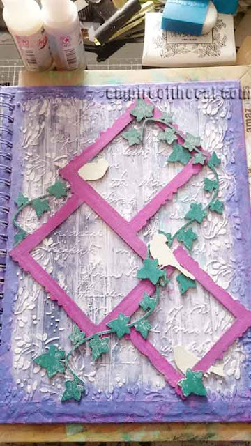 As this is one of my April DT posts I also used this chipboard set – Collage Frame Birds & Ivy from GSL – which I had originally thought of using on something else (this tag) but while it did fit on that enormous tag if I turned it on an angle, I felt like it was a bit of a waste to put it on a tag. I wanted to use it on something I would see often so what better than to put it on an art journal cover which I would see every time I used the journal! I cleaned off the edges and then painted it with white gesso.