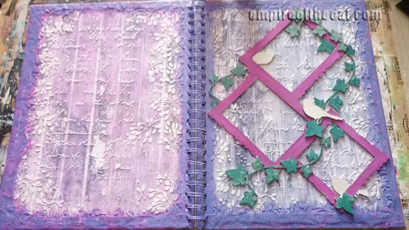 As this is one of my April DT posts I also used this chipboard set – Collage Frame Birds & Ivy from GSL – which I had originally thought of using on something else (this tag) but while it did fit on that enormous tag if I turned it on an angle, I felt like it was a bit of a waste to put it on a tag. I wanted to use it on something I would see often so what better than to put it on an art journal cover which I would see every time I used the journal! I cleaned off the edges and then painted it with white gesso.