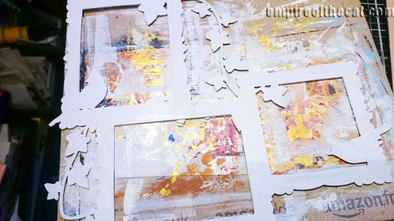 And now we get to my gelli print plan for this cover. They are not the same colour, but they are in the same colour family, and the technique used to make them creates a wood plank background that looks a little weathered and distressed, which I love. Here’s what the painted frame looks like on the front cover piece – loving the colours!