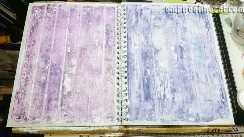 I decided I didn’t like the white edges that show through at the edges of the paper, so I decided to cover it up using another gelli plate tape technique. First I needed to make some prints so I used this gorgeous mix of purple acrylics.