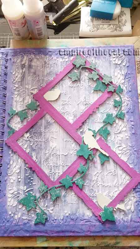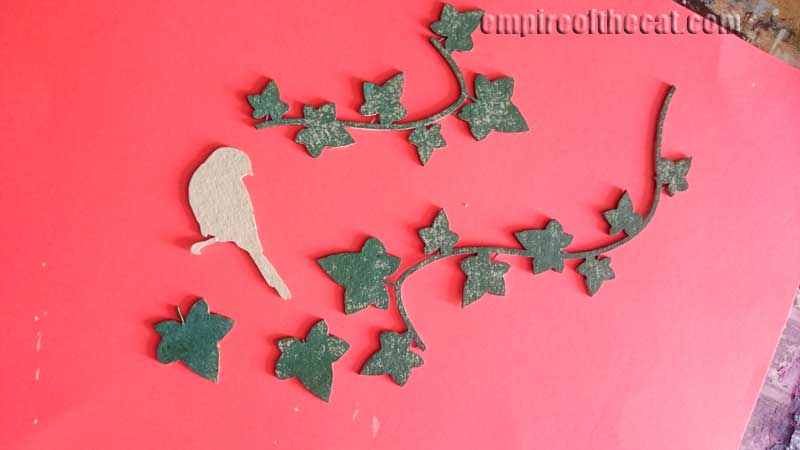This little frame comes with extra birds and extra ivy, both of which I wanted to add on top once the frame was attached to the cover.