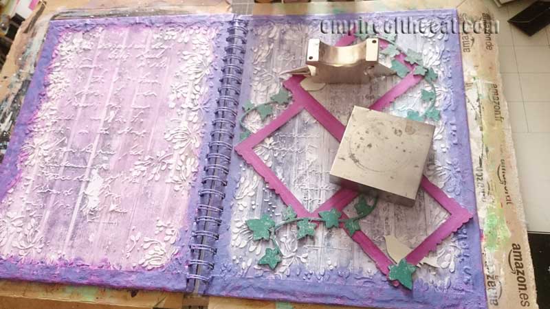 Once it was dry, I painted it with Paperartsy Fresco Chalk Paints in Byzantium and the leaves in Archival Library Green. Here’s how it looks against the sketch cover – just a final check of the position to make sure it fits the way I want it to.