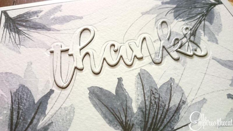 I had decided to use the inlaid die cutting technique to add the “thanks” sentiment to my card rather than stamping a sentiment on it because it was more subtle and I didn’t want to draw too much attention away from the beautiful details of my watercolour stamping. In order to make my card, I used some black cardstock behind my watercolour panel that was just 1mm bigger all round. Then I mounted the panel on to a card base made from Altenew Spicy Yogurt cardstock, which is one of my favourites. Once that was done it was time to start placing the die cut word into the space, starting with the two black die cuts first and finishing off with the one that was cut from the watercolour panel.