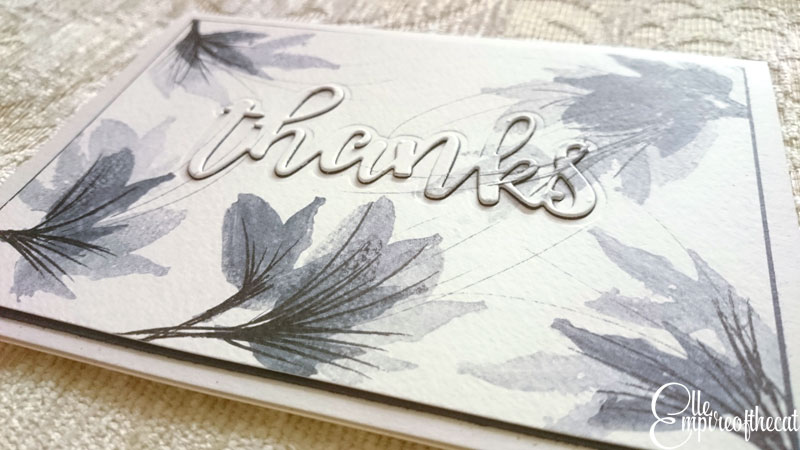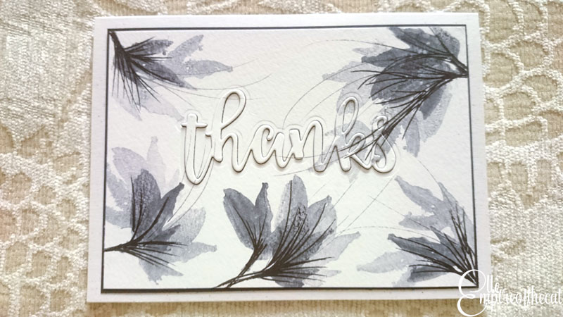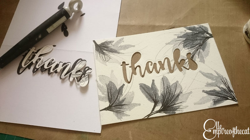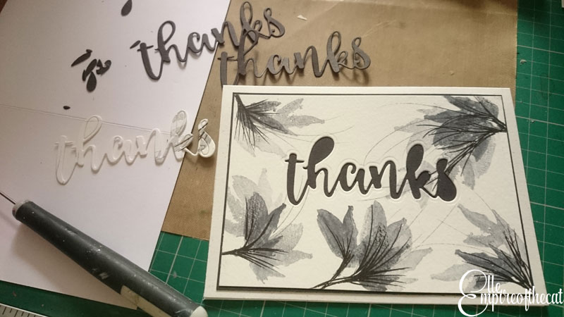 I created three different stamped images on watercolour paper, two with the black and one with the purple, using one piece of watercolour paper. The paper was cut in half and then one half was cut in half again, so they are basically 1 x A5 and 2 x A6 sizes. Then I used the Altenew Script Words 2 die to cut out the word “thanks” twice from black card and then very carefully from one of my A6 backgrounds as you can see below.