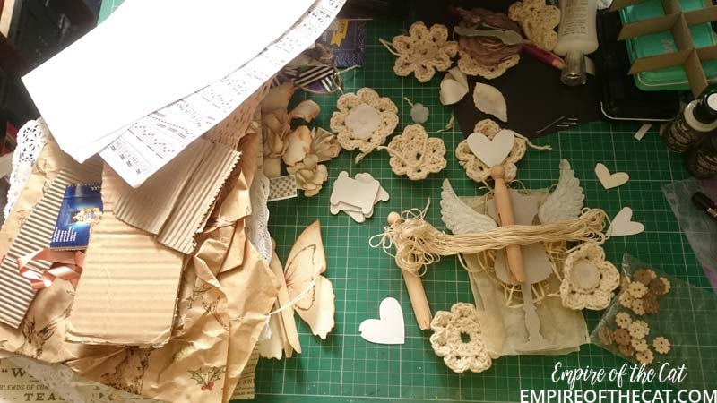 At least, this is the only bit of it that I can show you as it has super secret DT projects on the rest of it. So all I was left with was this little corner on the left where a large pile of leftovers was beginning to form. I started to tidy it up and then realised how many of them were in this same neutral colour palette, so I started to play around with a few bits and pieces as you can see on the right of the photo.