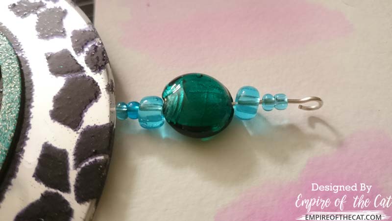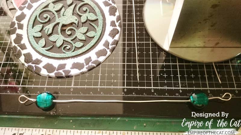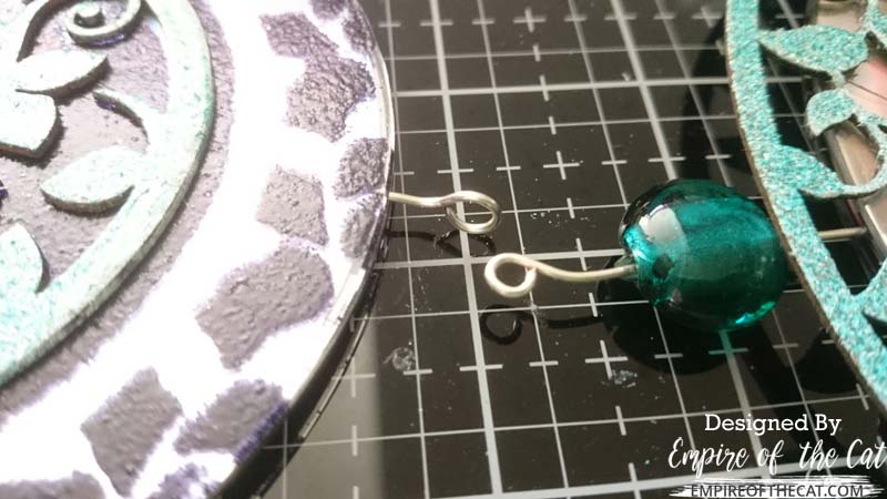 Now that everything was glued in place it was time to attach the CDs to each other to make the suncatcher. There are different ways of doing this, and I will give you some options at the end, but here’s what I did with mine. I cut three pieces of 18 ga wire that each measured eight inches long. I used my pliers to make an eye hook at one end of the wire and then threaded one of these green lampworked coin beads on to it.