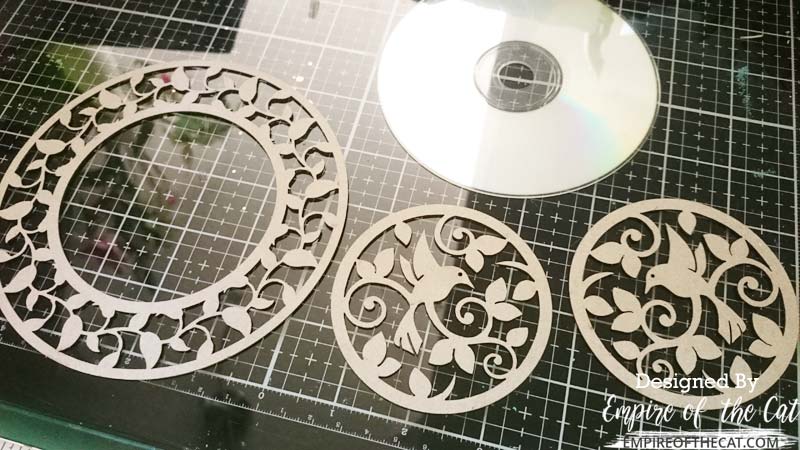 I was actually working on something else when I spotted the old CD-ROMs sitting on my table and my brain went off in a different direction, so after trying to fit them into the project I had already started, I decided to start over from scratch and make something else. I have these chipboards from GSL; on the left is the leafy circle frame and on the right is the hummingbird medallion, which had two in the pack. So I was looking at my CD and these chippies and trying to decide where to go next.