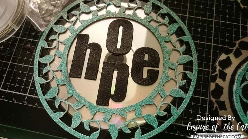 So now I have two CDs with hummingbirds in the centre, and one CD with the leafy frame but nothing to put in the centre of it, so I started to think of words that could maybe fit in that space, that I could die cut and embossed. I chose HOPE as I think we could all use a bit more of that at the moment. I also starting thinking about how I wanted to attach them to each other. I used this very strong Gutermann fabric glue to glue the chipboards to the CDs. It’s a glue I use a lot for gluing things to fabric, including metal hardware, so I knew it would definitely be able to glue chipboard and cardboard to metal no worries. I glued everything in place and put something heavy on them to hold them down while they dried. I use these Jeweller’s anvils since they are very small and deceptively heavy for their size and I have them because I make jewellery, but use anything you have that had has some weight – acrylic blocks are also good for this. As you can see I am using a big acrylic block with the anvils LOL