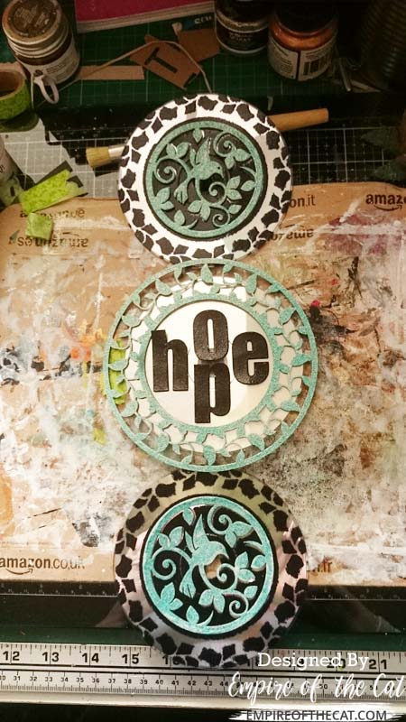 The HOPE letters are die cut using Altenew Bold Alpha dies to cut them out of cardboard and then I heat embossed them with the same Black Glint embossing powder as before.