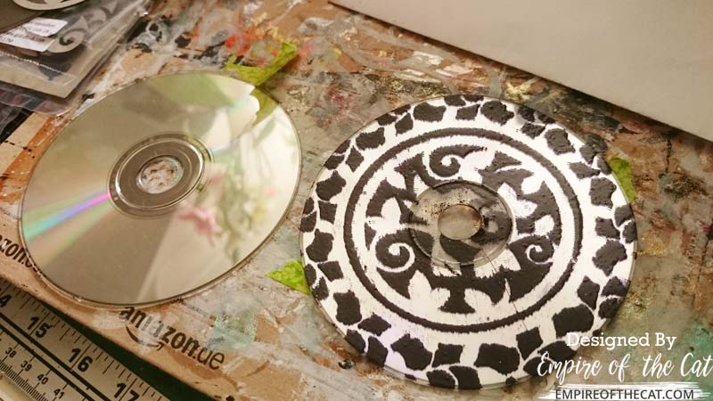 I then applied the Black Glint embossing powder and very carefully melted it with my heat gun. A word of warning here, CDs are made out of plastic, and can melt when heat is applied, so don’t be too aggressive with the heat gun and keep it moving over the surface of the CD to stop it warping. I have a Black and Decker heat gun that is intended for DIY not crafts, and I kept it on the low setting. Nothing warped but I did manage to crack one of the CDs afterwards! You can see it on the right in the photo below.
