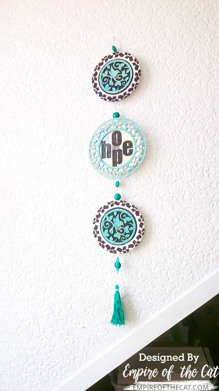 So at this point, we have two bird CDs with an eye hook and bead at the top and the straight end of the wire sticking out the bottom, and we have one HOPE leafy frame CD with an eye hook and bead at the top and bottom. Now it’s time to put it all together! Using pliers open the the eye hook on what will be the top bird medallion CD by turning it sideways. This ensures the integrity of the hook shape and allows it to be easily closed again. Hook the top eye hook from the centre CD through the open eye hook and then close it using pliers. Repeat this process with the bottom hook on the centre CD with the top hook on the bottom CD, which will attach all three CDs together.