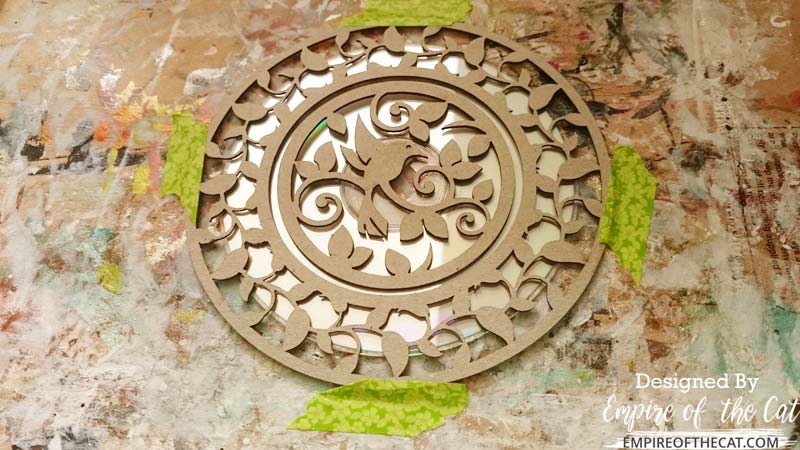 I thought that maybe I could use the chipboards as stencils and spray something through them like ink or paint, but I didn’t actually have anything that would adhere to the shiny CD and I didn’t want to cover them up with anything since the whole point was to have the shine. Thinking cap back on, I realised that I could try something else. so I taped the CD to the work surface and taped the chipboards on top, then got to work with some experiementing.