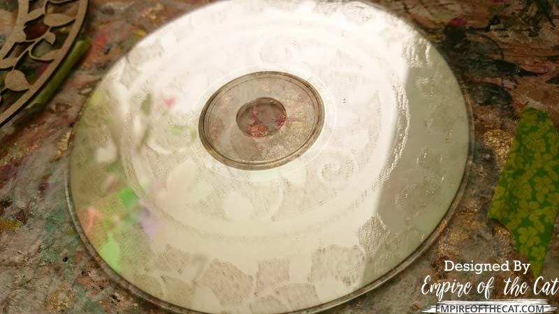 The embossing powder I used on the chipboards is called Sea of Tranquility and it’s a beautiful turquoise colour and contrasts well with the Black Glint. This gives a black shiny background for the bird. Now I could have just covered the whole centre of the CD with black and not worried about the stencilling but at that point I wasn’t sure where I was going with this idea and I was stencilling with the circle frame anyway.