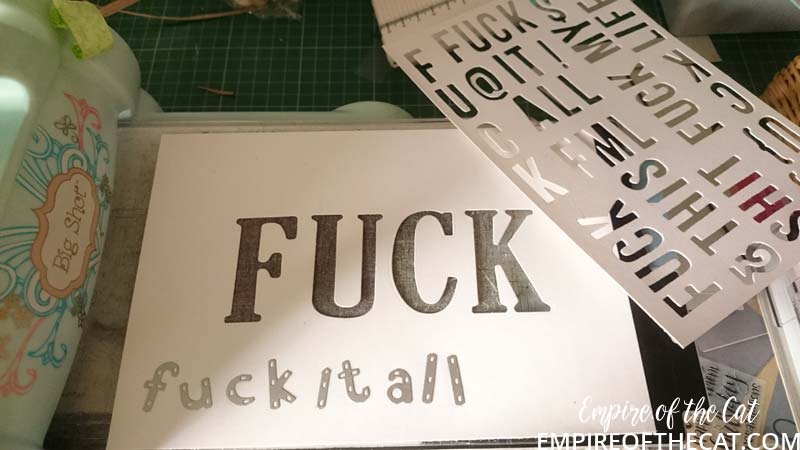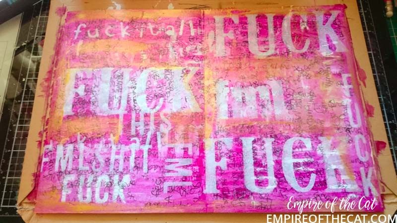 In the Youtube video she uses a stencil with some colourful words, so I decided to make my own colourful word stencil, using some cardboard and some alphabet dies in various sizes.
