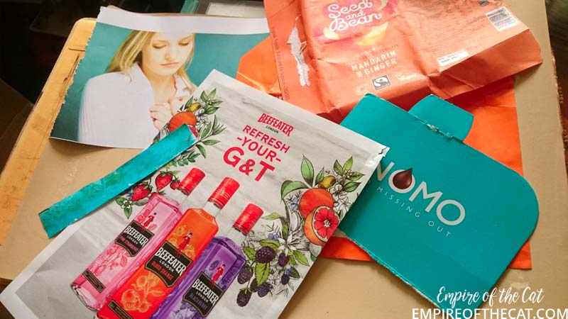 Collage materials – chocolate wrappers, easter egg box, gelli prints, book pages, gift wrap, handmade papers