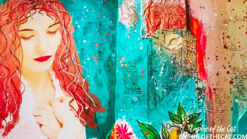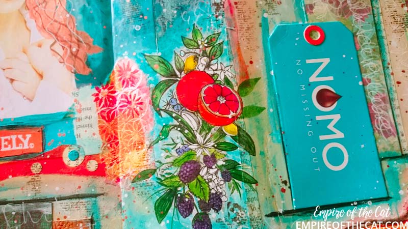OK so here’s my page. As it evolved I kept thinking that this sad-looking woman was in need of some chocolate – maybe a lot of chocolate lol. Chocolonely for those who don’t know, is a Dutch chocolate company (Tony’s Chocolonely) and it used to be the case that they were only available in Holland but now you can get them in a few places here as they started exporting last year. NOMO is a vegan chocolate brand and that stands for No More Missing Out. This packaging came from an Easter egg that a friend sent to me for my birthday this year. It was yum! Sometimes vegan chocolate has a weird aftertaste but this didn’t and it was Salted Caramel flavour and I was in chocolate heaven. Tony’s btw is not a vegan brand but they have a LOT of flavours and some of them are vegan.