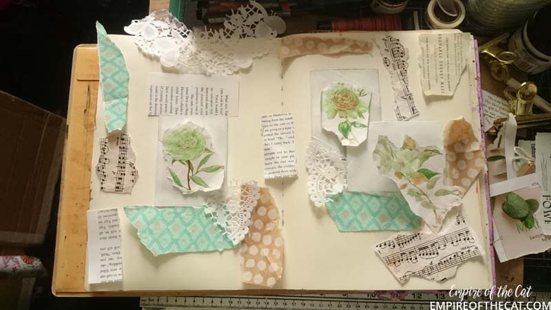 This page was inspired by the Tags and Pockets Challenge at Art Journal Journey as I had started thinking about tags + pockets, and came up with the start of an idea. A Vintage Journey also has a Tag You’re It Challenge this month, and I have already entered both challenges with a different page, but this one was my original idea for something with tags. It just took a little longer to come together (what with all the cleaning and recycling) so I’m glad I managed to find time to finish it today. At the same time I had noted last week that Funkie Junkie had an It’s a Wrap Challenge where you could use gift wrap and of course I was going to use some of that for sure when I started doing the collage!