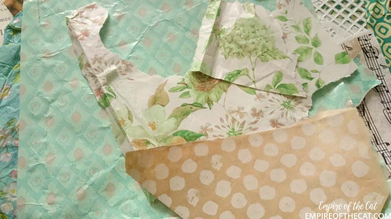 After sorting through my saved paper stash, I ended up with these three papers. The bottom one is one I bought from IKEA and the top two came from a friend who always finds the best papers to wrap her presents with and of course, I have to save it all. The one with the white and lime flowers is a few years old and quite creased as I think it took a beating coming through international post, but I held on to it all the same, so now it can be useful now. 🙂
