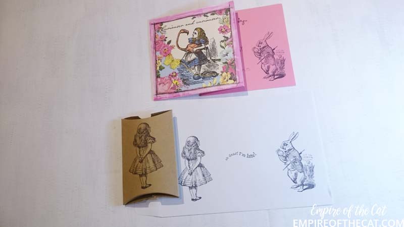 I have three friends and a friend’s daughter, who all have birthdays in August so I decided to make life easier for myself and make four cards at the same time using the same basic supplies and techniques. I recently got these really lovely Alice in Wonderland paper napkins that are too nice to actually use as napkins lol, so I wanted to use them to make the cards. Of course you can’t actually see the cards in the above photo because I have {in}conveniently covered them with the kraft boxes {oops} that I stamped for the other part of the gifts.