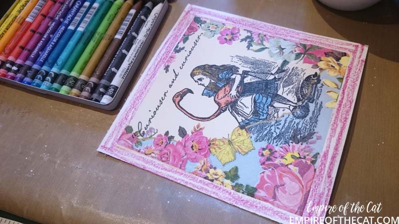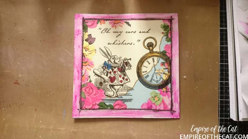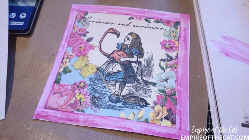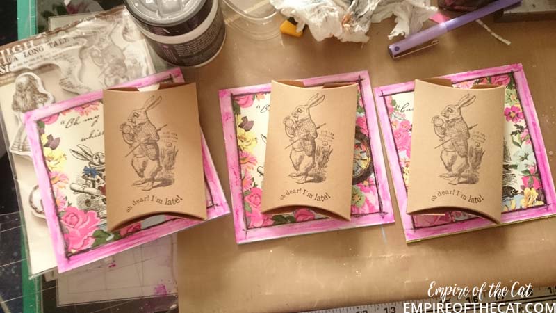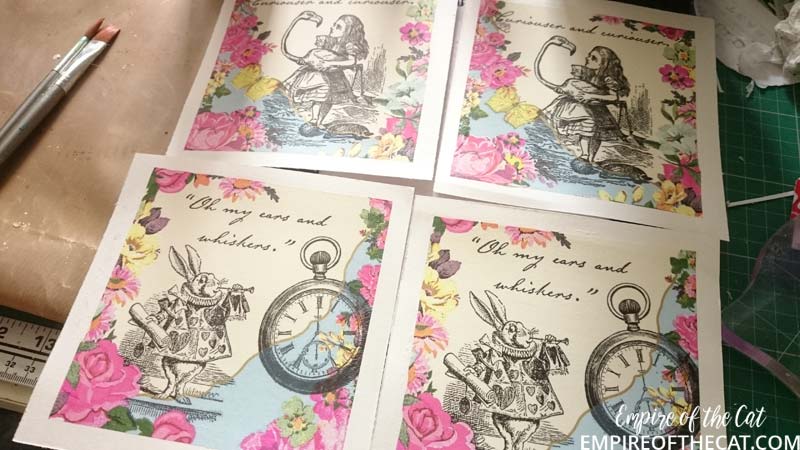I have three friends and a friend’s daughter, who all have birthdays in August so I decided to make life easier for myself and make four cards at the same time using the same basic supplies and techniques. I recently got these really lovely Alice in Wonderland paper napkins that are too nice to actually use as napkins lol, so I wanted to use them to make the cards. Of course you can’t actually see the cards in the above photo because I have {in}conveniently covered them with the kraft boxes {oops} that I stamped for the other part of the gifts.