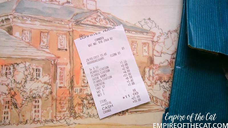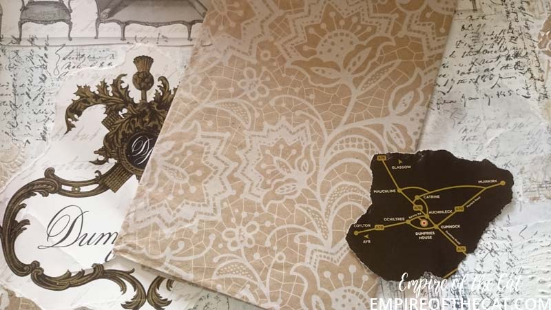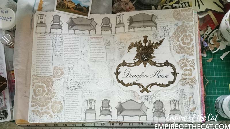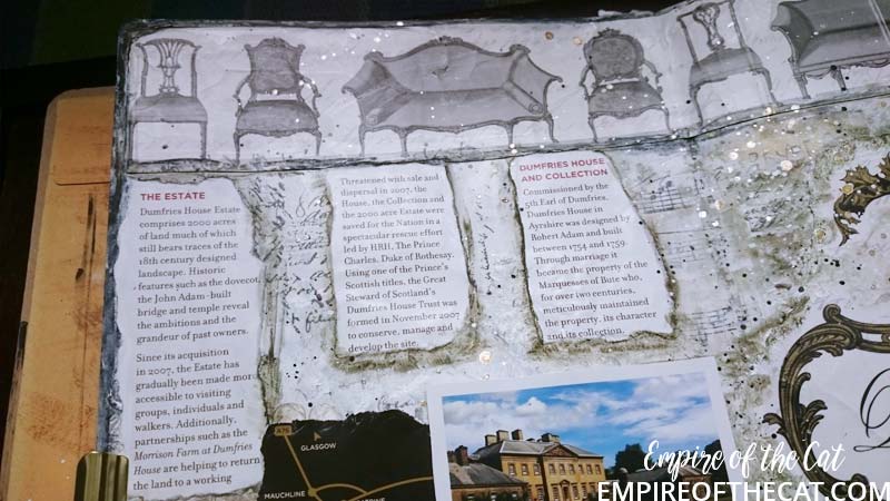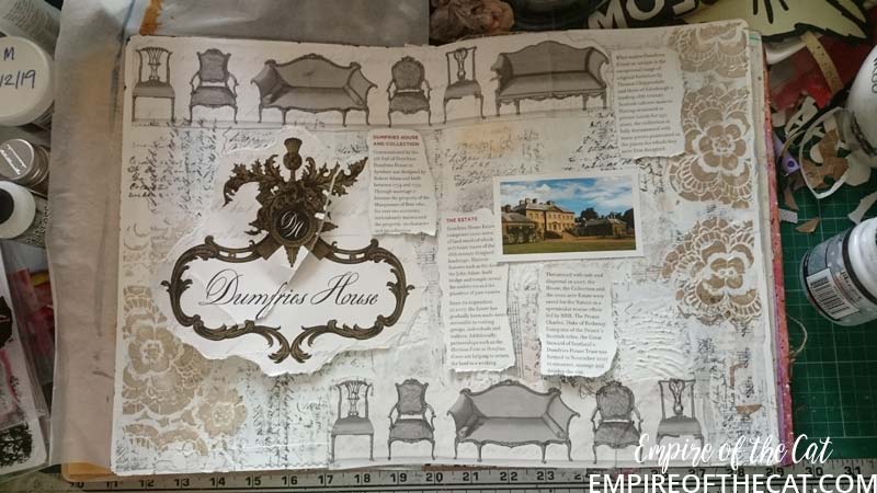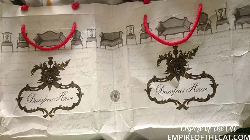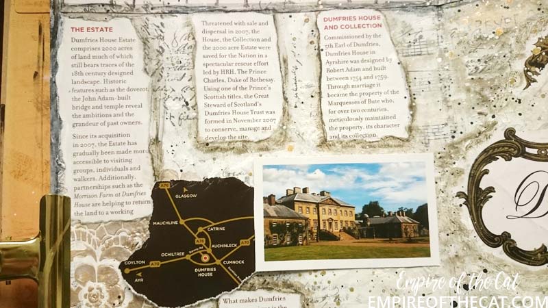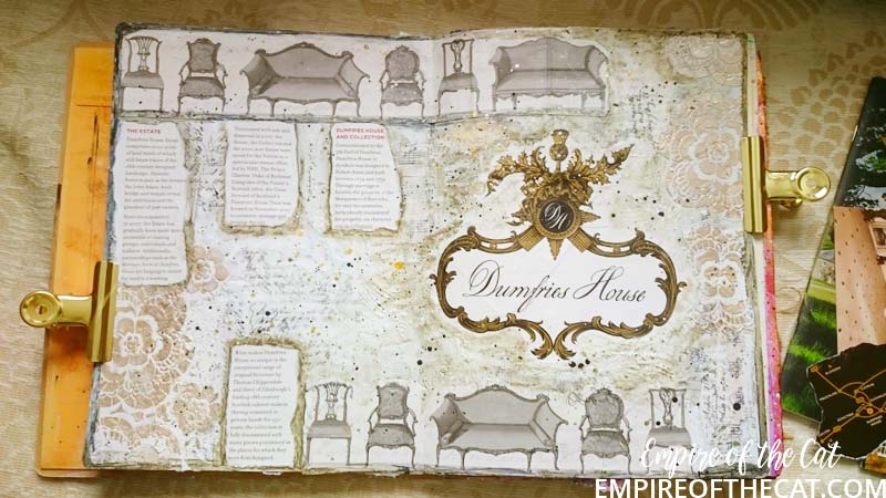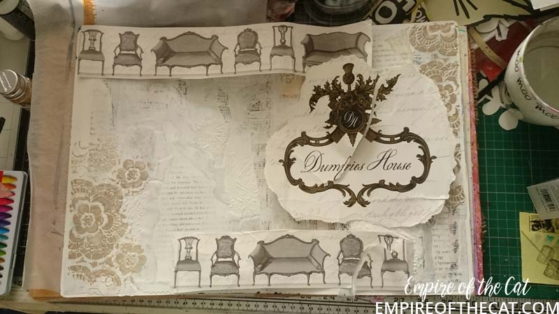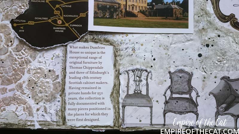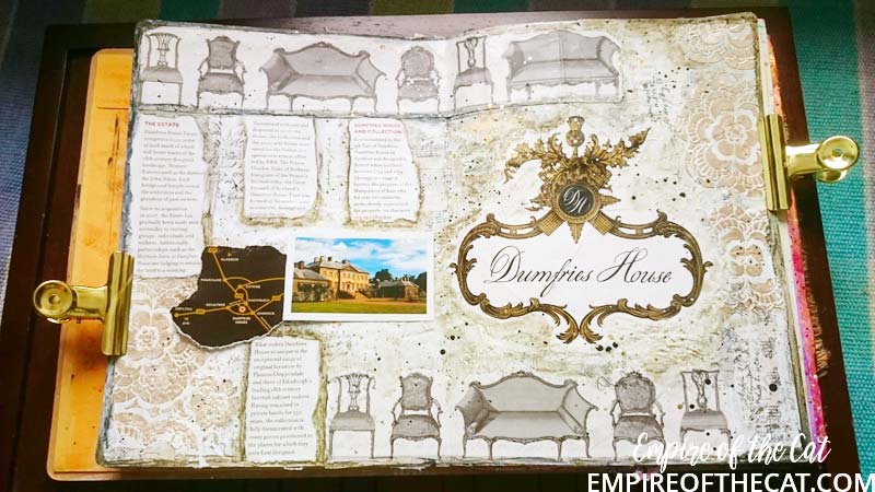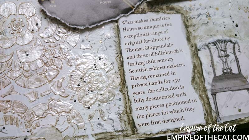So I had my eureka moment! The bag is goes perfectly with my background. I could use the chairs and the crest and bits and pieces and my page could have a purpose ie the day we took mum to tour Dumfries House. Yes sorry but more back story. There’s a lot of detail about Dumfries House on their website so I will save time and link you to it to read at your leisure, but basically it was going to be auctioned off and Prince Charles saved it. One of the interesting things about this house is it’s amazing collection of Chippendale furniture, so all of that was saved and preserved also. We go there quite often as it is very close to where I live and the gardens, coffee shops, restaurant and gift shop are open all year for free. This time since it was mum’s birthday we decided to pay for a guided tour of the house as a special treat. It’s the one and only time we have done that and it was really amazing to see everything. Oh I should also mention that the Boswell Book Festival is also now held here and so there are opportunities to see inside some parts of the house if you are attending the festival as some of the talks are held in the house and others in marquees, you know in the days when people could go to festivals that is. 🙁