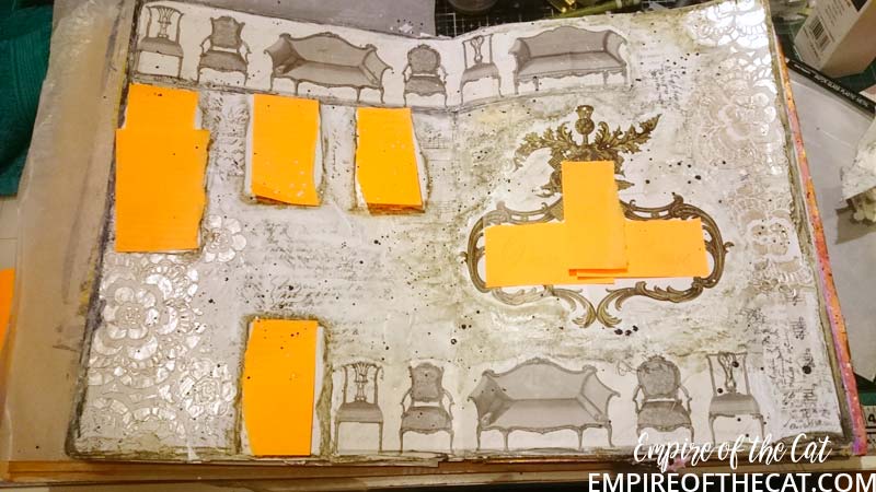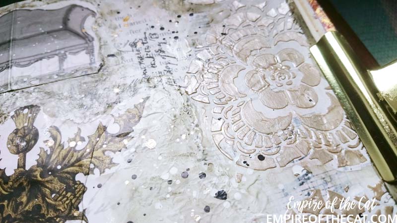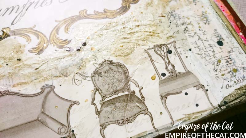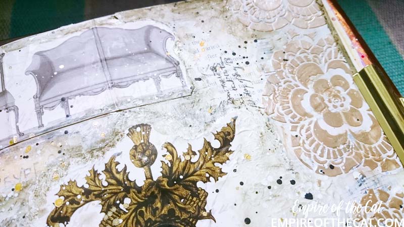 So that was all I did on the 18th – a bit of collage and gesso – and then I had to get on with other less fun things, and also if I am totally honest, I didn’t know where to go with the page. Fast forward to yesterday and I was determined to get something finished so I opened up my book and stared at this page for a while.