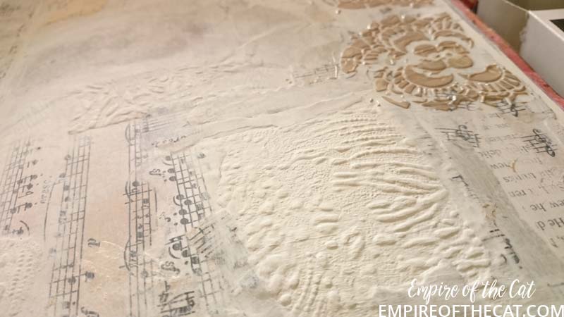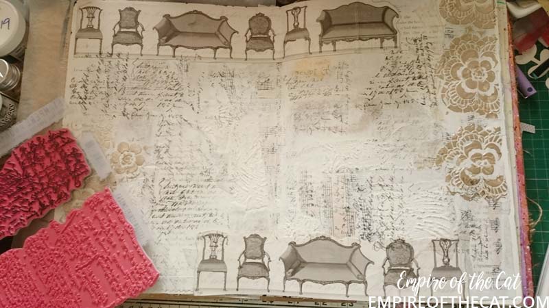 This bumpy wallpaper is one of FOUR LAYERS of wallpaper that we discovered was coating the bedroom walls! It looks much better in an art journal than on the walls!