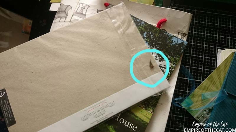 Then I looked down at the floor – this generally makes me feel more anxious because there is so much crap on the floor atm – but this little bag of goodies was on the floor. Back story: This bag has been in a box of stuff since 2011 (yes 2011) that’s NINE YEARS. I bought some things when I was visiting this historic house and then didn’t know what to do with them so, everything stayed in the box perfectly preserved. Some months ago I was decluttering, came across this bag that I had completely forgotten about, and inside it was a perfectly preserved DEAD WASP haha no clue how long that thing had been in there, but I thought it was time that I used the contents of this bag. I brought it into the craft room, whereby I managed to RIP THE BAG!!! After saving it for nine years in near perfect condition, I ripped it! Ugh I was so mad at myself, and so it lay around on the floor making me feel bad.