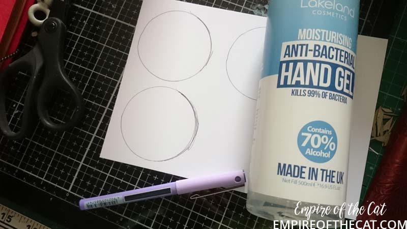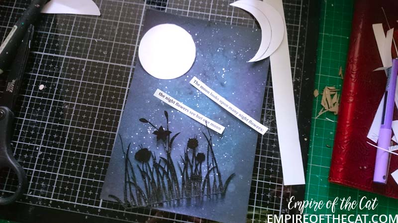 I needed a moon! I thought about having some kind of crescent moon but it looked weird on my card, so full moon it is! I was looking around for something to draw around and this handy economy sized bottle of hand sanitiser was just the right size! How convenient for me, but still weird that i would have bottle this size. Still getting used to the things we have to do nowadays to stay safe. FYI I do have a set of circle dies but I really couldn’t be bothered looking for them so I went with the lo-tech option.