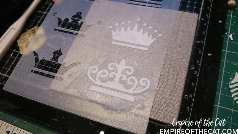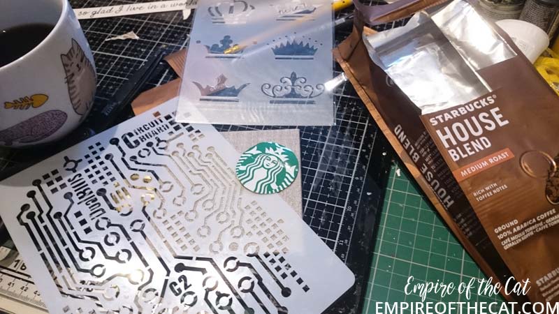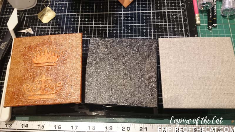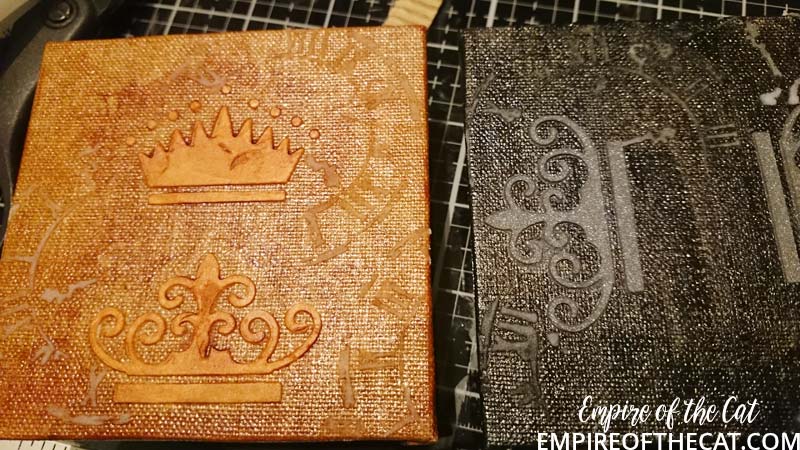 So my plan was to use Miss Starbucks and one of these little canvases. These mini ones come in a set of three. I have this stencil that is all different types of crowns and my brain thinks this one looks like an octopus – it even has eight legs! – so I used some texture paste and added to to the first canvas in it’s natural state still.