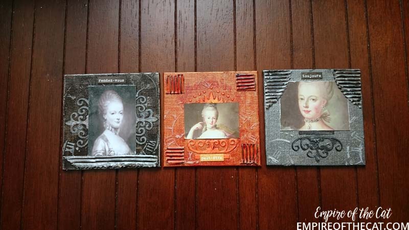 It’s getting dark so early now that it keeps catching me by surprise and it’s too dark to really take photos, so the choice is keep going with no photos or stop work until the next day. I hate stopping when I’m in the middle of something, so I kept going but I don’t have any more process photos! After the paste was dry, I also painted the cardboard pieces and then added them and the photos of Marie to each canvas. I added some highlights with some waxes in similar colours and then I really did stop for the night. In the morning I added these little stickers with the French words “rendez-vous”, “peut-être” and “toujours” which translate to English as “a meeting, arrangement or appointment” , “perhaps” and “always”. Again I was thinking about her secret society connections and possible hidden meanings in each canvas LOL