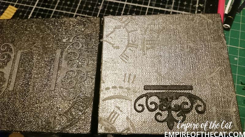 I wanted to add more to the backgrounds so I grabbed this clock stencil and some translucent grit paste, hoping that it would indeed dry translucent and not white and applied it at random!