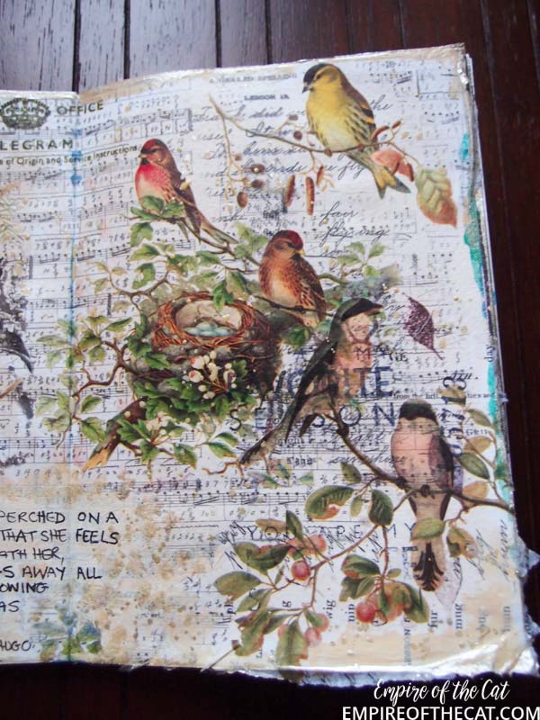 I was hoping to be able to get another page done but it wasn’t going to be this one, this one was a surprise! I was doing a bit of Black Friday sale browsing and one of the shops I buy from had a sale on Tim Holtz products, and I saw this bird/aviary collage paper so I put it in my basket. Then just before I was about to purchase, I just thought I would just check which of his collage papers I had as this one did look a little familiar, and sure enough it was there in the drawer with the rest of them, still sealed up and unused! Needless to say, I didn’t proceed with my order lol and so I decided that I would use the one that I didn’t know I had, on this page! So I started on this last night, and there is so much chaos in the room that I actually had to stand up to do my collage haha. I decided to use this page which just had random test stamping and paint on it.