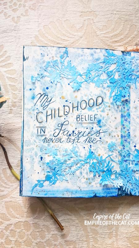 What a fabulous story behind this page Elle. And even just as fabulous is this page. Wow! What a beauty. I think the idea of fairies is wonderful and why couldn’t it be true? I am glad you joined us for day 1 at Art Journal JOurney. Loved this entry. Thanks and happy December! Hugs-Erika