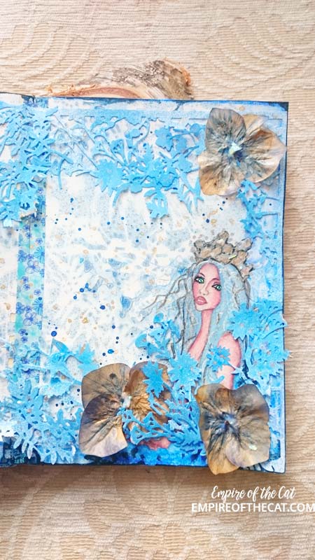 I have some blue hydrangea flowers from my garden that I have been drying so I thought they might look nice on the page as extra foliage and hide the edges of the watercolour paper. When they are in full bloom they are a beautiful range of blues and purples but when they dry, they dry to this faded blue which is also beautiful. I really needed to fix her mouth at this point too as it looks like she’s foaming at the mouth – rabid fairy perhaps?