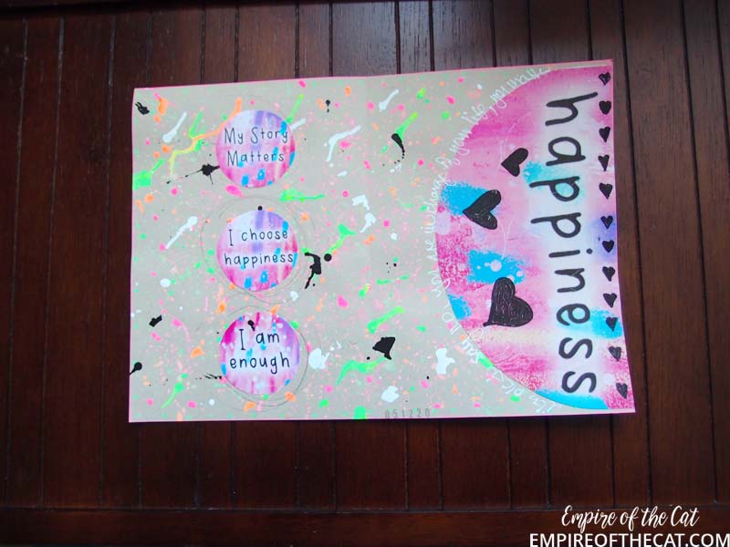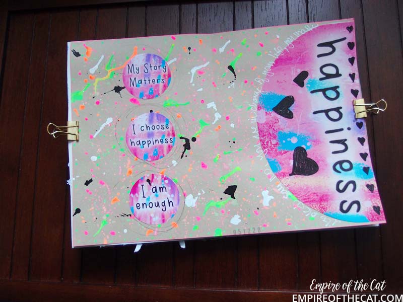 So that meant that I still had these BIG sticker “mistakes” and I wondered if I could use them for something. I feel that I should slap the I AM CAPABLE half sticker on a t-shirt or something just as a reminder haha but I probably won’t. The HAPPINESS sticker is the bottom half of “I choose happiness” so I thought maybe I could use in my journal. I can’t peel it off as a sticker since it’s a sheet of little sticky labels so I would have to just cut around the shape and keep the backing paper attached. So that was it, I would make a “happiness” page based around that giant sticker and see what developed. I spent some time experimenting with my paint markers to see what would happen and I like this very graffiti look that appeared. Very splattery – I love it!