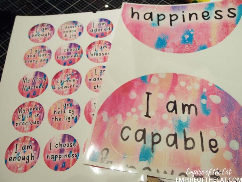 And finally, I signed up for Life Book 2021 and as part of that, there were some PDFs in the virtual gift bag that accompanies the course, and I decided to print them out. Unfortunately they printed out at a HUGE size and so I ended up with a page of stickers that looked like this (on the right) instead of what I wanted (on the left). So glad I only put one sticker sheet in the printer or I would have had multiple pages at this huge size lol. After a bit of tweaking, I ended up with usable stickers of the right size. BTW if you used a sheet of sticker paper that was A4 or Letter sized sticker it would have been ok and I could have cut around them and possibly used them but I used a sheet of round sticker labels so they are not usable as stickers – you can see the label outlines in the word CAPABLE below. So I could have sticker that said CA but not very useful haha.
