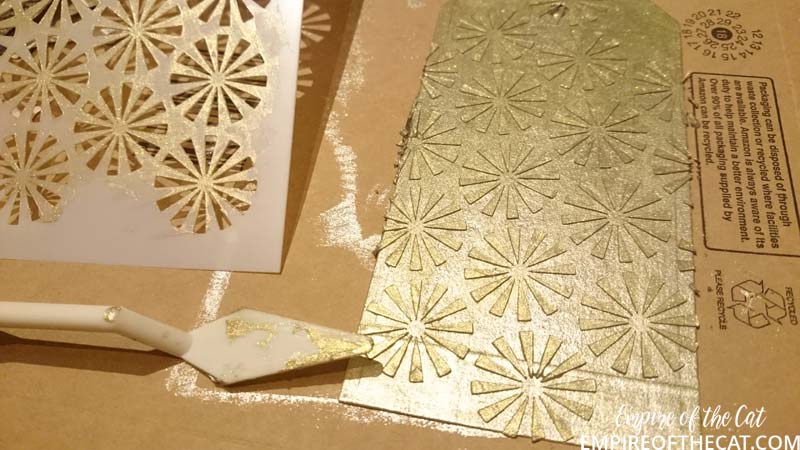 This stencil reminds me of the paper fans from the mood board, so I used it with some icing paste to cover my tag background.