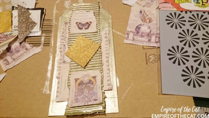 I started playing around with some possible placement of the elements I wanted to use on the tag. I also painted the tag and the corrugated cardboard with gold paint.