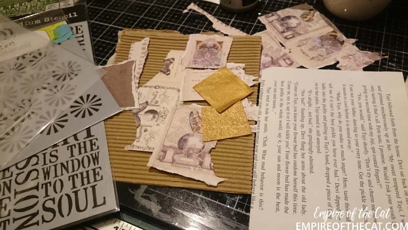 I pulled out a few bits and pieces that I might want to use, including some stencils, some book paper and some paper scraps and some corrugated cardboard from a Felix cat food box (so handy!)