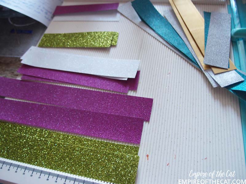 If I had used cardstock this would have been easier and quicker as it would have had colour on both sides. As I was using glitter cardstock that was only glitter on one side and white on the other, I cut extra strips and glued them down on the white sides.
