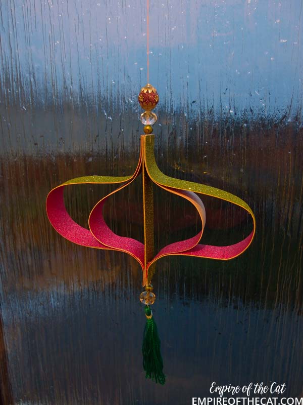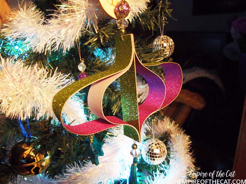 Hi Festive Friends! Not long now but still time to sneak in another holiday themed post and this time it is a very glittery (and so now is my house!) Christmas ornament made from glitter cardstock and a few bits and pieces I had lying around. It’s actually not made for the tree, it’s too big! I made it to hang on the hall door but I put it on the tree so you can see just how big it is next to the other ornaments!