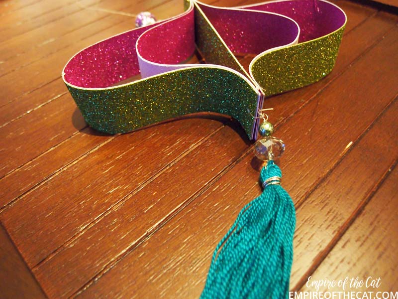 After leaving it a good while to dry, I was able to carry on with the threading of the beads on to the top of the ornament and more beads and a handmade tassel on to the bottom.
