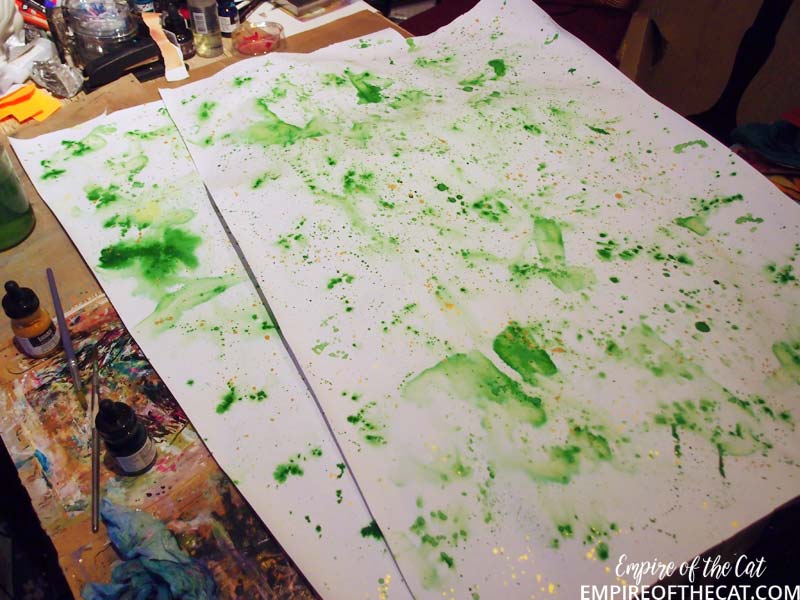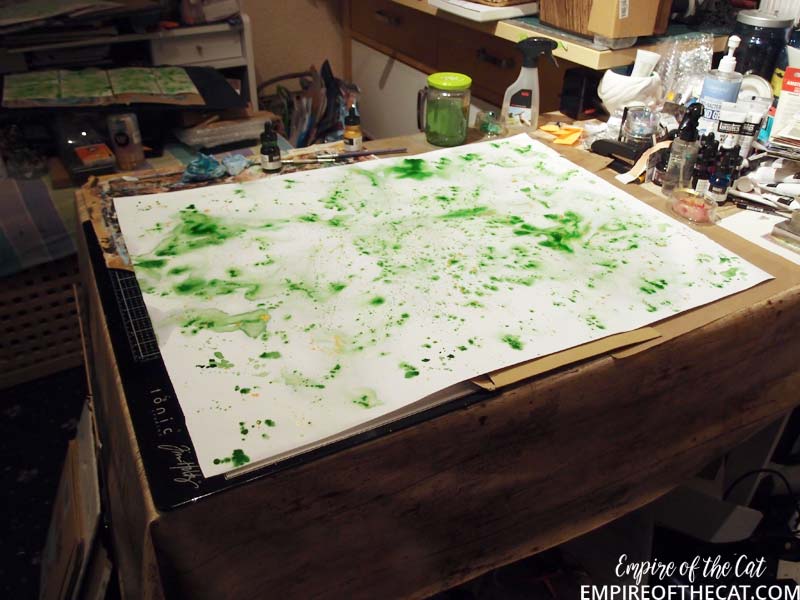I rolled out a piece that would fit on the space I made on the table, and then started splattering it with the same ink and spraying it with water.