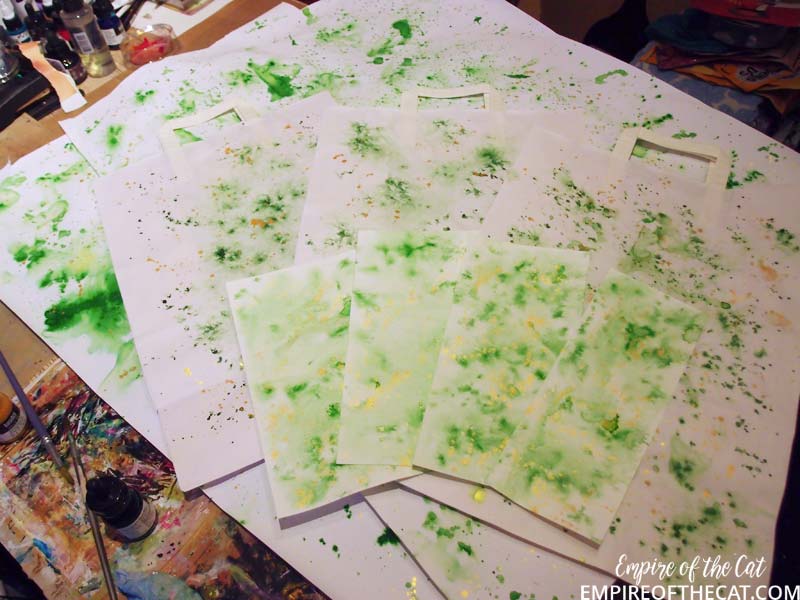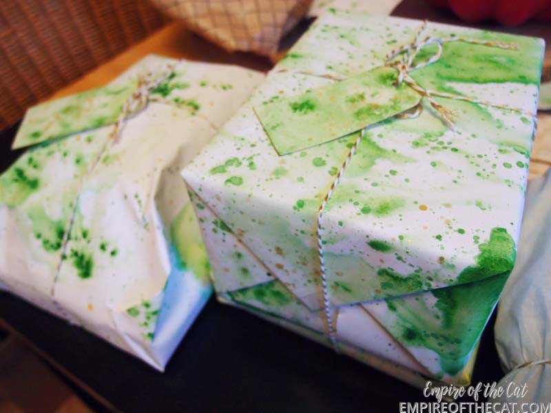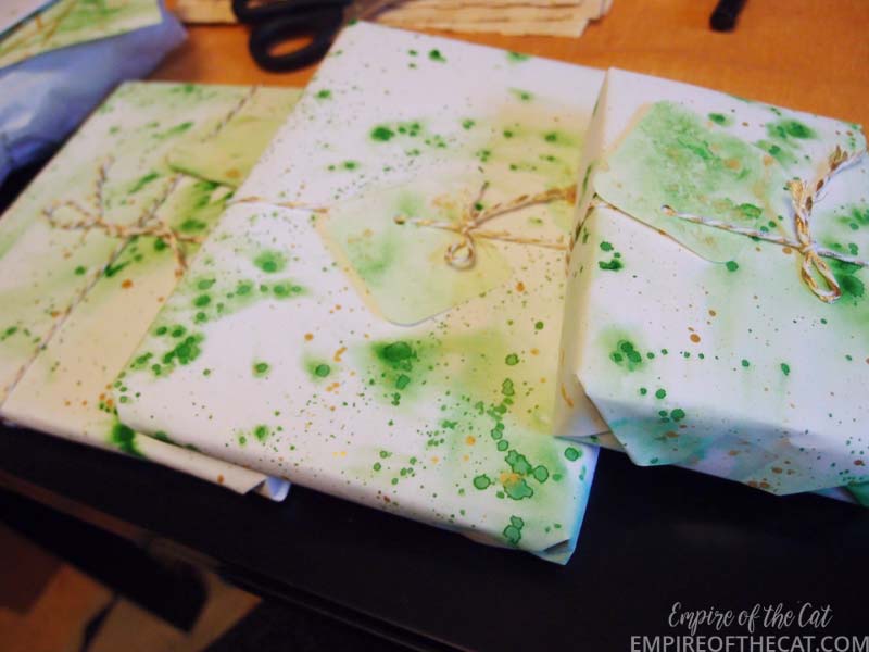 Here’s how they looked all wrapped up and ready to go in the gift bags. I just love all that green splattery goodness!